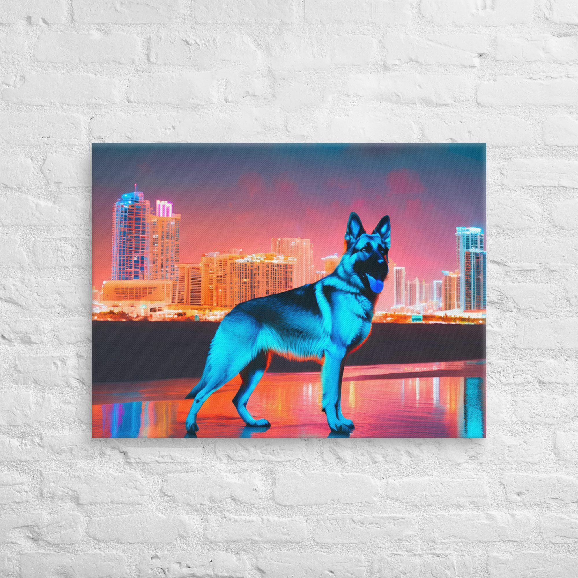 Embrace the protective elegance and unwavering loyalty of the German Shepherd, artfully captured against Miami’s luminous skyline. Radiating sophistication, this premium luxury canvas beautifully combines the breed’s intelligent and watchful nature with the glamour of Florida’s iconic coastal cityscape.